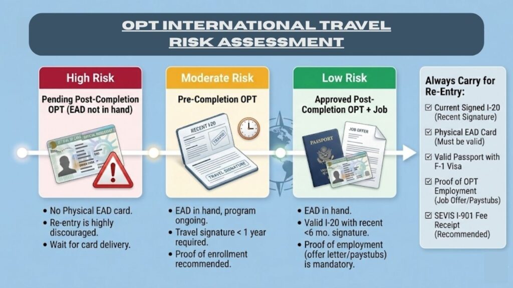 This guide explains OPT travel risks, visa renewal requirements, and the documents needed for safe re-entry in 2026.